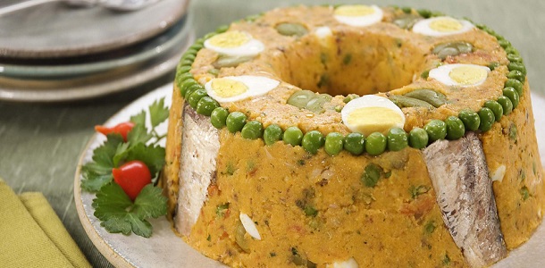 Em uma panela funda aqueça o óleo e frite a cebola. Acrescente a ervilha, o milho, o orégano, as azeitonas, o molho de tomate e a água. Deixe ferver. Em seguida, adicione a farinha de milho e misture até engrossar. Coloque em uma assadeira untada com azeite, os ovos cozidos em rodelas e os tomates. Aperte bem com uma colher. Deixe esfriar e desenforme. Para decorar use camarão, sardinha ou palmito.