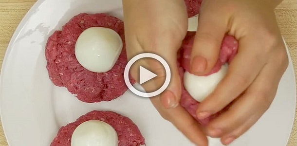 - Colocar los huevos duros en el centro de cada hamburguesa, moldear la carne para que esta cubra la totalidad del huevo hasta formar una albóndiga.
