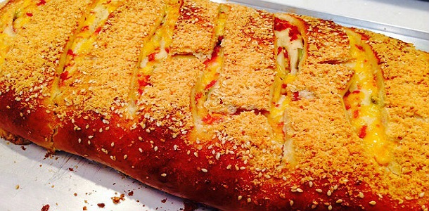 – Ponha o pão recheado numa assadeira, faça pequenos cortes em diagonal na parte de cima do pão. Pincele com gema e polvilhe com queijo ralado. Leve ao forno pré-aquecido a 190ºC por cerca de 25 minutos ou até dourar.
