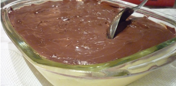 A continuación, poner la mitad de la mezcla de crema y flan.